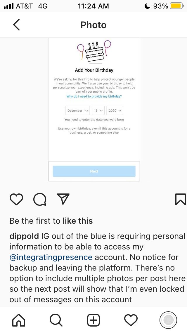 12/24/1919 is obviously not my real birthday. With zero notification or options given to export my account and exit, blackmail and extortion by a human-less IG leaves zero recourse for this my choice for momentary misrepresentation. I’m open to consider meeting with any organic lifeforms (from Instagram or otherwise) to determine trust whether to divulge DOB. My phone number and many modes of contact are on my website. Furthermore, direct messaging from my other @dippold IG account says “Sorry, this page isn’t available” while it recently worked before this. Nor where multiple images for one post allowed. I choose not to speculate as to causes and conditions (here, now).