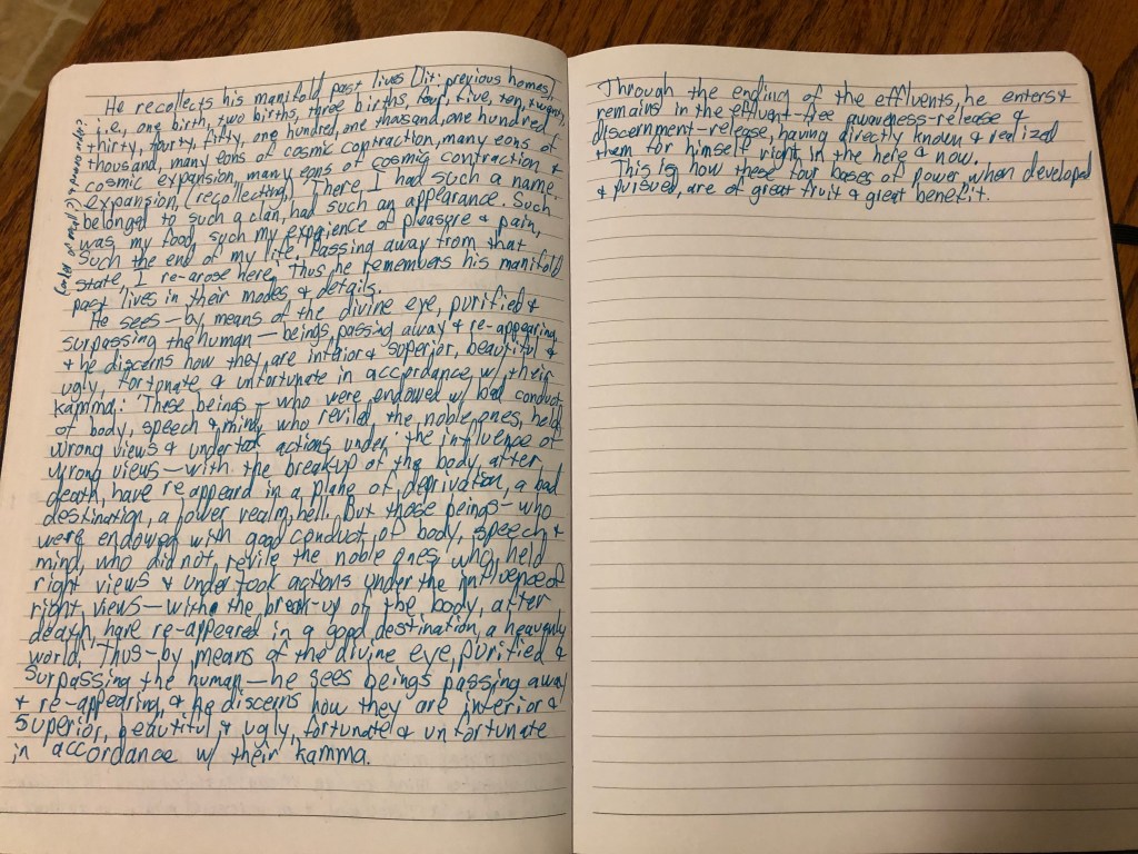 Some of the more esoteric insights, correlations and comparisons came upon the first read, but the nitty gritty details came piecemeal day after day, session after session. I even did a doodle to encapsulate some of the practice approaches and wrote down one translation of the entire sutta long hand, expanding it out by adding the redundant standard textual omissions in the text(s) included here.