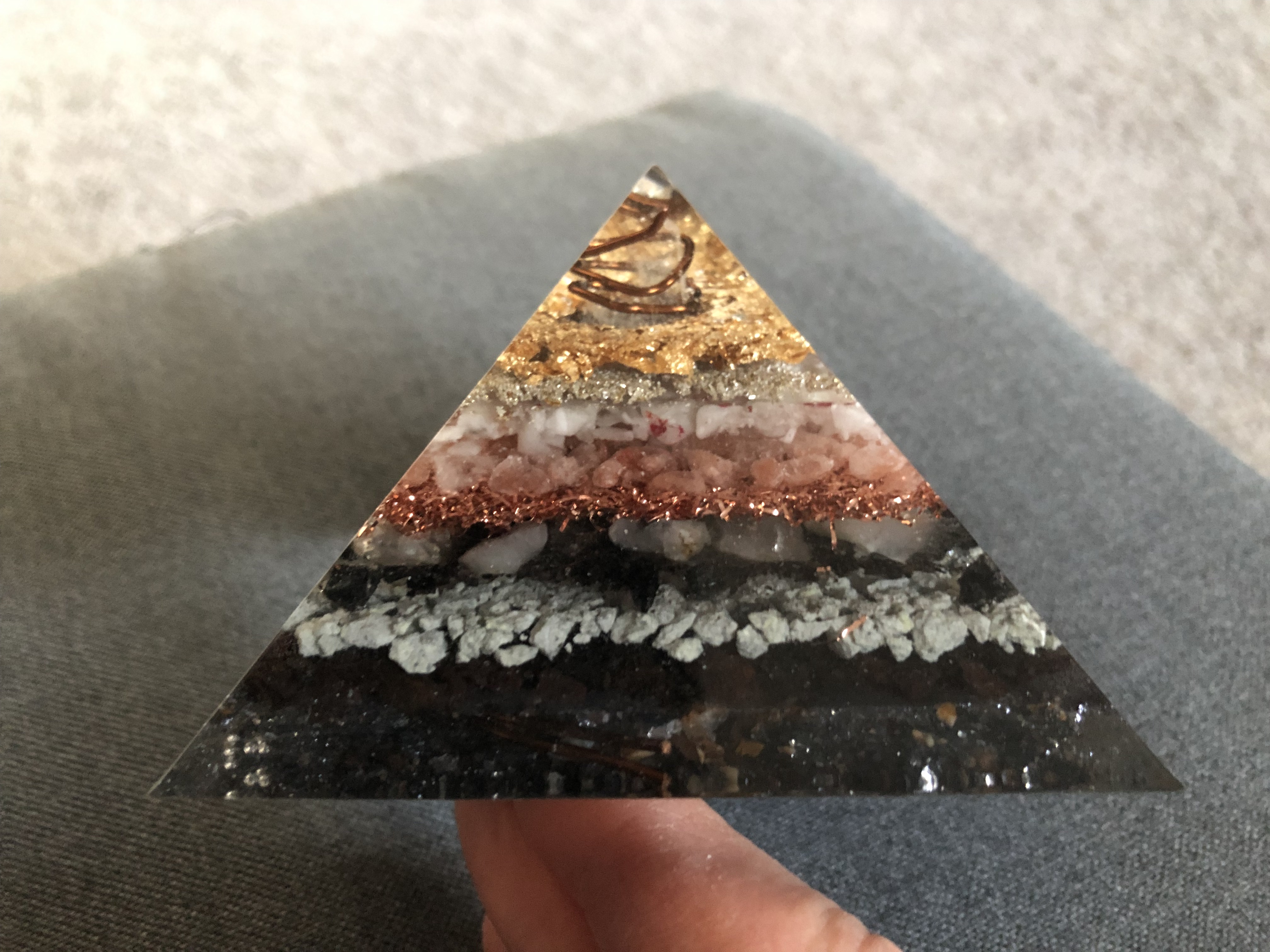 Custom Orgonite from alternativelifeguide.com where I provided the crystals (except for the wire wrapped quartz) and the intent: “to support any and all required transformations and transmutations for the well-being, awakening and liberation of all as allowed by, and in alignment with true cosmic law”